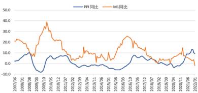 圖1 M1、PPI當月同比增速走勢