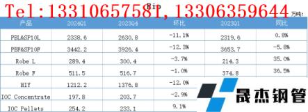 PBL&SP10L第一季度產量2338.6萬噸,環比下降11.1%,同比上升0.8%;PBF&SP10F第一季度產量3442.2萬噸,環比下降12.3%,同比下降5.8%;Robe L第一季度產量289.4萬噸,環比下降3.7%,同比上升35.0%;Robe F第一季度產量511.5萬噸,環比下降1.0%,同比上升36.5%;HIY第一季度產量1212.2萬噸,環比下降12.0%,同比下降11.3%;IOC Concentrate第一季度產量197.8萬噸,環比下降2.9%,同比下降6.4%;IOC Pellets第一季度產量254.2萬噸,環比上升9.1%,同比上升16.1%。