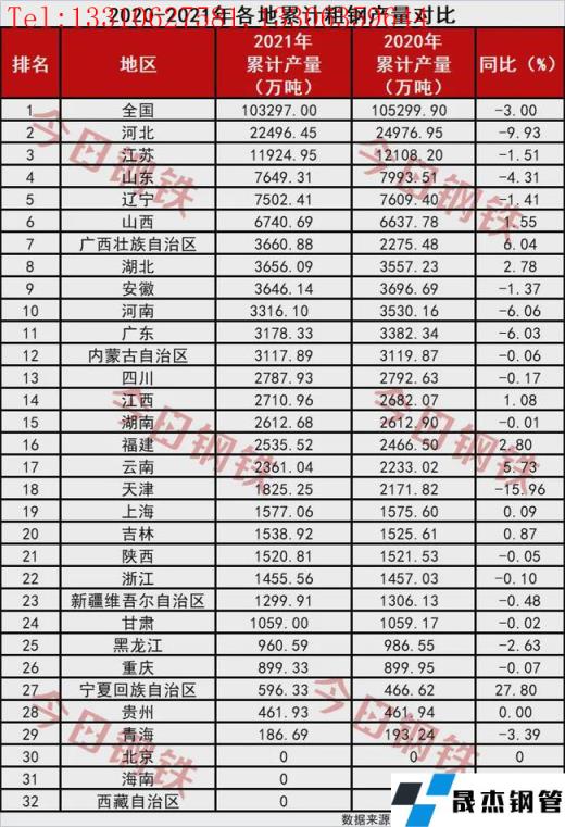 從分省數據來看,對比2020年各省數據,2021年4省市粗鋼產量同比降幅超5%。其中河北降9.93%、河南降6.06%,廣東和天津分別降6.03%、15.96%。詳見下表: