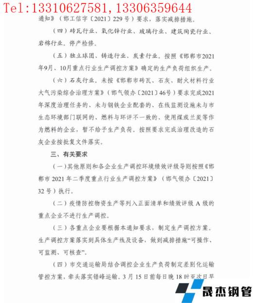 從方案中了解到,鋼鐵行業3月15日前按照市工業和信息化局、市生態環境局“關于下達2021-2022年采暖季鋼鐵行業錯峰生產粗鋼產量的通知”(邯工信字[2021]230號)要求,確保限產到位,粗鋼產量控制到位。3月15日至3月底,績效等級A級企業、完成超低排放改造的全廢鋼短流程煉鋼企業自主采取減排措施;B級鋼鐵企業限產30%,C級限產35%,D級限產50%。(新建企業績效等級按C級執行)