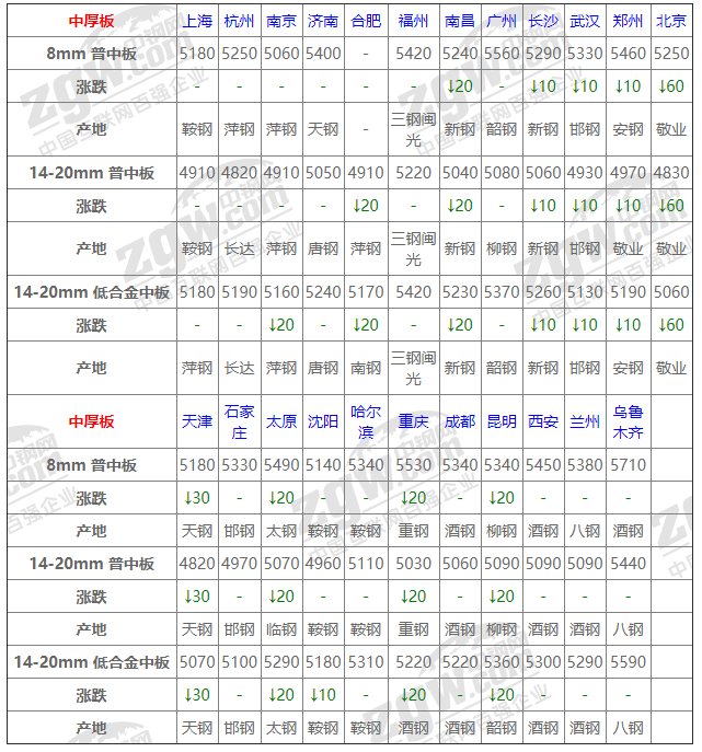 全國23個主要市場14-20mm 普中板平均價格5020元/噸,較上個交易日下調10元/噸。