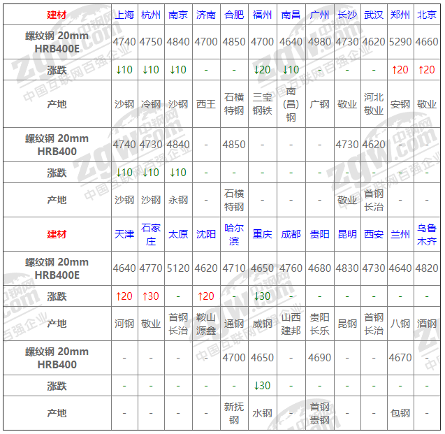 全國24個主要市場螺紋鋼 20mm HRB400E平均價格4770元/噸,較上個交易日上調2元/噸。