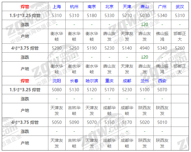 全國15個主要市場1.5寸*3.25 焊管平均價格5196元/噸,較上個交易日下調1元/噸。