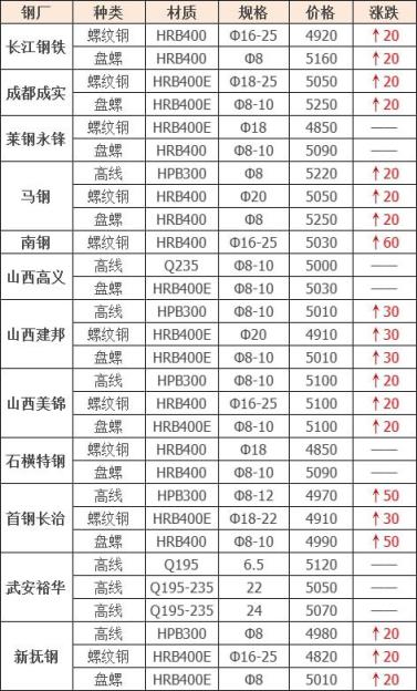 18日廣東河源德潤鋼鐵到廠漲60:鋼筋切粒3550;邊角料,新鋼板料3520;純鋼筋頭,直鋼筋3500;模具鋼、料頭圓鋼、軌道鋼、火車輪3500;硅鋼片停收;冷軋、熱軋、碎料沖子3450;優重3500;鍛打料、馬蹄鐵3500;重廢3450;機械生鐵、高碳鋼、鑄鋼件、生熟混裝3450,厚剪3400,不含稅