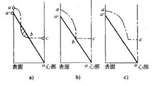 表中數據表明:感應加熱淬火半軸的靜扭強度高于調質半軸,感應加熱淬火層愈深,其靜扭強度愈高。數據還表明,40MnB鋼中頻感應加熱淬火可以代替40CrMnMo鋼調質半軸。表5 中數據還表明:中頻感應加熱淬火半軸疲勞壽命比調質半軸提高很多倍,因此半軸調質處理工藝多數已被中頻感應加熱淬火所取代。(2)半軸感應加熱淬火工藝參數的選擇:半軸淬硬層深度的確定應以保證半軸內任何一點的扭轉應力均小于或等于該點的剪切屈服強度。圖3 中點劃線表示半軸感應加熱淬火后的強度分布情況,a'o表示半軸的扭轉應力分布情況。若淬硬層太淺,則半軸強度不足,圖3a中b'b區域為危險區;若淬硬層太深,圖3c,則由于半軸表層殘留壓應力降低而降低疲勞壽命。合適的淬硬層深度應如圖3b所示。