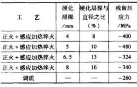 ▲圖4半軸表面淬火的硬化層深度花鍵部:齒根硬化層深度(按測量到半馬氏體區計算)應達到花鍵部軸頸的10%(δ1=10%D)。桿部:硬化層深度應達到桿部直徑的15%(δ2=15%D0)。法蘭根部:要求法蘭盤與桿部連接的過渡圓角淬硬。在實際生產中,圓角處硬化區域的最小直徑應比半軸桿部直徑大25%。這些要求是為了保證半軸的靜強度和疲勞強度?;ㄦI與桿部的淬硬層深度對靜強度影響較大,法蘭圓角淬硬對疲勞極限影響較大。每種表面淬火半軸都有最佳的硬化層深,應考慮到硬化層深對表層殘留壓應力的影響。表6 列出了直徑為50mm的帶法蘭半軸感應加熱淬火后花鍵尾根部位的殘留壓應力。▼表640MnB半軸感應淬火后表面殘留壓應力