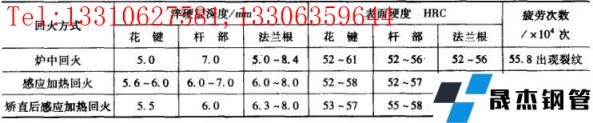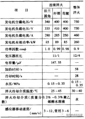 數據表明,感應回火的疲勞壽命較爐中回火為高。其原因是,感應快速加熱時,最表層首先瞬時產生馬氏體分解,使體積收縮處于相變超塑性階段,待整體回火完成后表層形成更大的壓應力,具有一個更理想的有利于提高疲勞強度的應力分布;而爐內加熱緩慢沒有這種條件。(3)半軸感應加熱表面淬火舉例,40MnB鋼制造的帶法蘭半軸的表面淬火工藝技術要求見表8 ,其淬火工藝可以采用連續加熱淬火和整體一次加熱淬火,工藝參數見表9 和表10 。▼表840MnB鋼半軸表面感應淬火技術要求