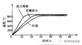 ▲圖7采用矩形感應器整體一次感應加熱淬火時,半軸表面的均溫加熱曲線由于在有效圈A端圓?。ㄒ妶D6) 上鑲有硅鋼片導磁體,所以法蘭根部圓角部位升溫較快,加熱均溫時間長,保證了該處的硬化層深和足夠的硬化區域。采用整體一次感應加熱淬火還能提高花鍵齒頂的硬度。采用矩形感應器加熱時,由于感應器和零件之間間隙較大(一般為5~8mm),所以升溫慢,加熱時間長,硬化層厚且均勻。半軸回火也可采用矩形感應器加熱,采用15~20℃/s的升溫速度,控制感應加熱回火溫度在(250±10)℃范圍內,可以使半軸表面硬度控制在52~63HRC的范圍內,性能良好。
