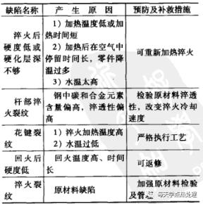 5 半軸的常見熱處理缺陷及預防補救措施半軸調質的常見熱處理缺陷的預防及補救措施見表14。半軸表面感應加熱淬火的常見缺陷的預防及補救措施見表15。▼表14半軸調質的常見熱處理缺陷的預防及補救措施