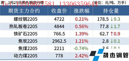 焦炭:1月25日,焦炭市場暫穩運行。山西長治地區今日有環保部門會議,1月30日-3月13日冬奧會期間,區域內焦企結焦時間延長至72小時限產政策影響;個別焦企明后兩天,環保管控結焦時間將延長至72小時,大部分焦企暫無接到冬奧會相關限產通知。本周焦企開工小幅上升,焦炭產量增加,下游無縫鋼管廠采購依舊積極,焦炭整體庫存也在低位,出貨無阻。冬奧會臨近,各個地區無縫鋼管廠限產預期較強,焦炭需求或有下降,無縫鋼管廠補庫情緒減弱。焦煤價格繼續維持高位,焦炭成本壓力依然較大,預計短期內焦炭市場繼續偏穩運行,后期需繼續關注環保政策、冬奧會、原料成本對焦炭價格的影響。