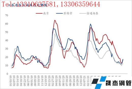 如上圖所示,2020年1月23日省會南京市場庫存占全省現貨庫存的21%左右,屬全年較低水平;而4月9日前后基本占全省庫存的41%;20年上半年南京市場庫存均保持較高水平,而下半年開始庫存便逐漸走低,蘇錫常庫存累庫增加。2021年1月8日南京庫存占全省庫存的24%,從4月初開始到本年度結束,南京庫存占比基本維持在40-42%左右,11月5日占比最高達到年度最高值,約50/%。2021年全年,南京市場庫存均保持較高水平,僅在年初階段,蘇錫??値齑媛愿哂谀暇?。整體來看,今年南京市場現貨資源一直處于相對充裕的狀態,且部分無縫厚壁鋼管廠家庫存前移也是保證該市場建材供給較為穩定的重要因素,而徐通揚泰區域則因價格波幅巨大,市場參與者主動囤貨意愿不高,全年庫存相較去年小幅減量。