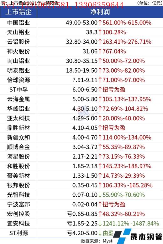 免責聲明:本網站(山東聊城晟杰無縫鋼管廠www.gdqiayu.com)刊載的“23家上市鋁企披露2021年業績預報,超8成凈利潤增長”等均源于網絡,版權歸原作者所有,且僅代表原作者觀點,本文所載信息僅供參考。轉載僅為學習與交流之目的,如無意中侵犯您的合法權益,請及時聯系刪除。本網站刊登此篇文章并不意味著本站贊同其觀點或證實其內容的真實性,我們不對其科學性、嚴肅性等作任何形式的保證。如果侵犯了您的版權,請盡快聯系我們予以撤銷,謝謝合作!