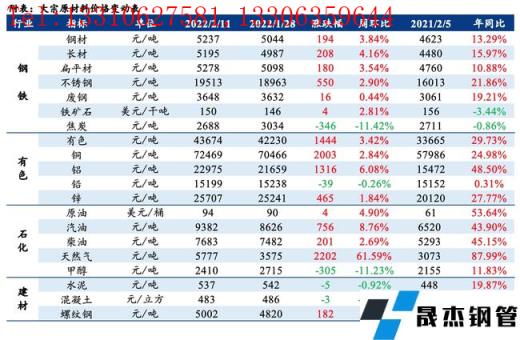 免責聲明:本網站(山東聊城晟杰無縫鋼管廠www.gdqiayu.com)刊載的“周報:大宗原材料價格周報(2.07-2.11)”等均源于網絡,版權歸原作者所有,且僅代表原作者觀點,本文所載信息僅供參考。轉載僅為學習與交流之目的,如無意中侵犯您的合法權益,請及時聯系刪除。本網站刊登此篇文章并不意味著本站贊同其觀點或證實其內容的真實性,我們不對其科學性、嚴肅性等作任何形式的保證。如果侵犯了您的版權,請盡快聯系我們予以撤銷,謝謝合作!