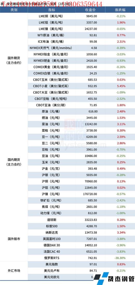 免責聲明:本網站(山東聊城晟杰無縫鋼管廠www.gdqiayu.com)刊載的“受近期局勢影響大宗商品價格一覽表(2月24日)”等均源于網絡,版權歸原作者所有,且僅代表原作者觀點,本文所載信息僅供參考。轉載僅為學習與交流之目的,如無意中侵犯您的合法權益,請及時聯系刪除。本網站刊登此篇文章并不意味著本站贊同其觀點或證實其內容的真實性,我們不對其科學性、嚴肅性等作任何形式的保證。如果侵犯了您的版權,請盡快聯系我們予以撤銷,謝謝合作!