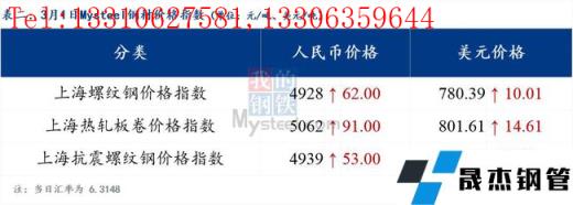3月1日普鋼絕對價格指數變化:綜合指數5157.2,上漲42.54;螺紋鋼指數4900.55,上漲27.42;線材指數5239.08,上漲34.27;熱軋板卷指數5061.44,上漲80.37;冷軋板卷指數5511.43,上漲29.88;中厚板指數5147.09,上漲38.62。