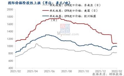 國際鋼價自俄烏沖突以來迎來了階段性上漲,截至2月28日,歐盟及東南亞進口CFR價格月環比分別上漲100美元/噸和82美元/噸,另外美國進口價格也在2月中下旬停止了下跌趨勢開始企穩。