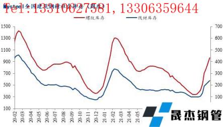 統計建筑厚壁無縫鋼管社會庫存總量為1205.15萬噸,月環比增加552.93萬噸,年同比減少334.69萬噸;其中螺紋鋼庫存965.28萬噸,月環比增加447.84萬噸,年同比減少256.68萬噸;線材庫存239.87萬噸,月環比增加105.09萬噸,年同比減少78.01萬噸。