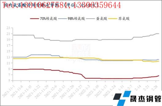 受玉米原料上調影響,近期各廠家報價較為堅挺,截止今日,國內70賴氨酸市場價格漲至6.4-7.1元/公斤之間,98賴氨酸漲至11.8-12.5元/公斤之間,蘇氨酸市場穩定運行在11.2-12元/公斤之間,蛋氨酸市場偏強運行在21元/公斤以上,色氨酸穩中上調至50-55元/公斤之間。雖然部分地區部分品牌仍有低于市場的成交價格,但貨源較少,市場多數仍在觀望為主,部分貿易商價格停報停簽,或者低價不簽,多數仍看好后市行情。