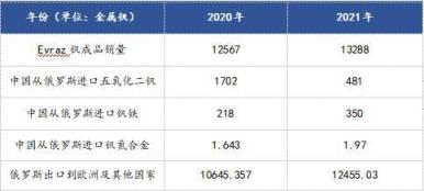 俄羅斯作為全球第二大的釩合金生產國,據俄羅斯Evraz公司近兩年釩成品銷量顯示,Evraz出口釩成品數量在1.3萬噸上下,其中2020至2021年Evraz公司出口到中國釩成品數量折金屬釩分別是1920噸,831噸,其釩成品主要銷往歐美國家。