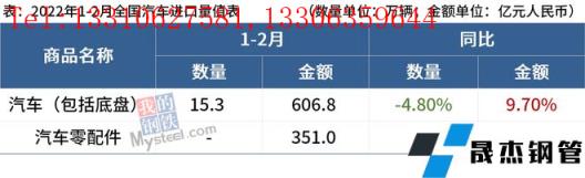免責聲明:本網站(山東聊城晟杰無縫鋼管廠www.gdqiayu.com)刊載的“海關總署:1-2月中國出口汽車47.7萬輛,同比增69.70%”等均源于網絡,版權歸原作者所有,且僅代表原作者觀點,本文所載信息僅供參考。轉載僅為學習與交流之目的,如無意中侵犯您的合法權益,請及時聯系刪除。本網站刊登此篇文章并不意味著本站贊同其觀點或證實其內容的真實性,我們不對其科學性、嚴肅性等作任何形式的保證。如果侵犯了您的版權,請盡快聯系我們予以撤銷,謝謝合作!