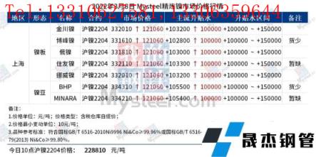 免責聲明:本網站(山東聊城晟杰無縫鋼管廠www.gdqiayu.com)刊載的“鎳價極端行情之下 下游壓力凸顯”等均源于網絡,版權歸原作者所有,且僅代表原作者觀點,本文所載信息僅供參考。轉載僅為學習與交流之目的,如無意中侵犯您的合法權益,請及時聯系刪除。本網站刊登此篇文章并不意味著本站贊同其觀點或證實其內容的真實性,我們不對其科學性、嚴肅性等作任何形式的保證。如果侵犯了您的版權,請盡快聯系我們予以撤銷,謝謝合作!