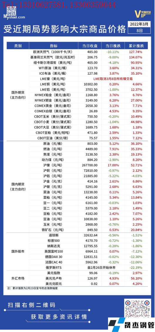 免責聲明:本網站(山東聊城晟杰無縫鋼管廠www.gdqiayu.com)刊載的“受近期局勢影響大宗商品價格一覽表(3月8日)”等均源于網絡,版權歸原作者所有,且僅代表原作者觀點,本文所載信息僅供參考。轉載僅為學習與交流之目的,如無意中侵犯您的合法權益,請及時聯系刪除。本網站刊登此篇文章并不意味著本站贊同其觀點或證實其內容的真實性,我們不對其科學性、嚴肅性等作任何形式的保證。如果侵犯了您的版權,請盡快聯系我們予以撤銷,謝謝合作!