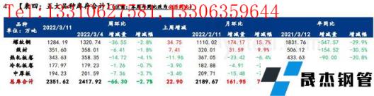 據統計,本周五大品種庫存總量為2351.62萬噸,環比上周減少66.3萬噸,其中建材庫存減少42.96萬噸,降幅為2.6%;板材庫存減少23.34萬噸,降幅3.2%。上期庫存總量為2417.92萬噸,環比上周增加22.9萬噸,其中建材庫存增加42.16萬噸,增幅為2.6%;板材庫存減少19.26萬噸,降幅2.5%。