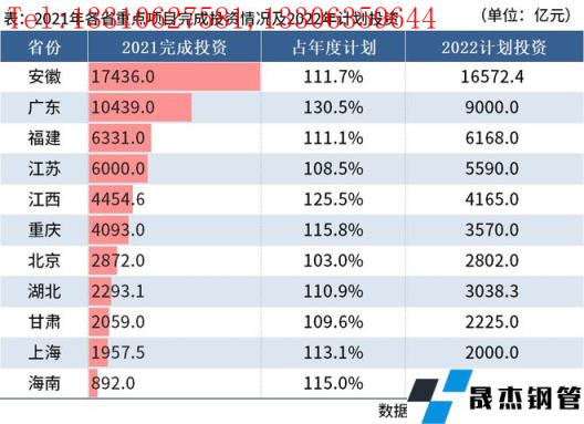 據不完全統計,截至3月16日,已有11個省份公布其2021年重點項目完成投資情況。根據地方政府公開資料顯示,11個省份2021年重點項目共完成投資近5.9萬億元,且均超過當年計劃目標。2022年,上述11省份共計劃投資近5.6萬億元,其中安徽省計劃投資超1.65萬億,排名第一。