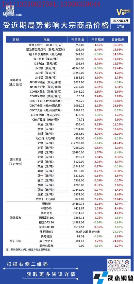 免責聲明:本網站(山東聊城晟杰無縫鋼管廠www.gdqiayu.com)刊載的“受近期局勢影響大宗商品價格一覽表(3月17日)”等均源于網絡,版權歸原作者所有,且僅代表原作者觀點,本文所載信息僅供參考。轉載僅為學習與交流之目的,如無意中侵犯您的合法權益,請及時聯系刪除。本網站刊登此篇文章并不意味著本站贊同其觀點或證實其內容的真實性,我們不對其科學性、嚴肅性等作任何形式的保證。如果侵犯了您的版權,請盡快聯系我們予以撤銷,謝謝合作!