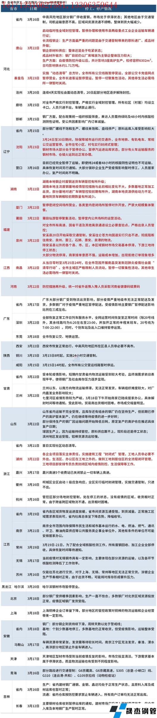 其中,3月22日,唐山市啟動臨時性全域封控管理,暫停辦理和使用市縣兩級重點工業企業運輸車輛通行證。沈陽于3月24日至30日期間,除保障城市運行的交通外,全市地鐵、有軌電車、常規公交運營暫停,全市住宅小區、村屯實行封閉式管理;厚壁無縫鋼管市場大部分處于暫停辦公、暫停汽運進出庫狀態,部分有火車運輸服務的厚壁無縫鋼管市場、倉儲火運到達正常辦理。3月20日福建泉州安溪縣開始采取交通管制,除安溪縣以外的各個縣、市、區,本區域厚壁無縫鋼管市場交易基本停滯,下游工地待停工狀態。具體情況如下: