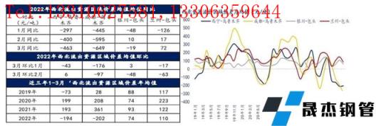 今年以來,烏魯木齊價格震蕩走高,主要原因在于,一、去年停產較早,停產面積較大,無縫厚壁鋼管廠家無壓力,給貿易商的結算價較高;二、市場啟動,無縫厚壁鋼管廠家逐步挺價推漲;三、庫存同比持續性低位,貿易商拋貨意愿低,挺價意愿高。綜上三大原因,西北資源流出比例明顯偏低,伴隨著近期新疆天氣好轉,市場恢復成交,近期價格逐步走低,區域價差將逐步恢復。