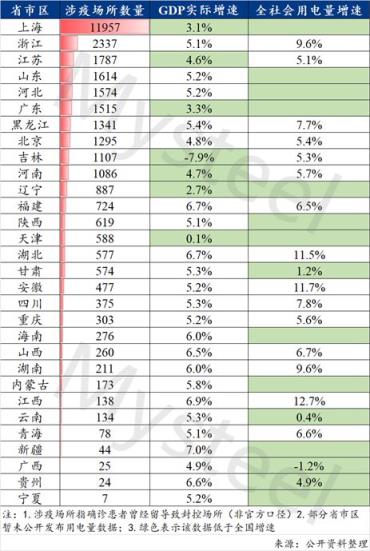 表1.截至5月7日全國省份涉疫場所數量與一季度GDP、用電量增速排名