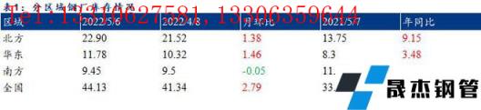 接下來再比較區域庫存的表現情況,從表1可以對比得出。目前北方、華東區域增庫較為明顯,分別高于同期9.15萬噸、3.48萬噸。主要是自3月份以來,北方、華東區域受疫情困擾,物流嚴重受阻,而無縫厚壁鋼管廠家產能利用率依舊保持高位,在產量不減的現狀下,而廠庫無法外移,導致廠庫持續累積。據了解,5月7日,營口市再次發布新冠肺炎疫情防控指揮部消息,結合當前嚴峻的疫情形勢,營口市疫情防控指揮部決定提級管理,從即日起:實行全天24小時管制,交通信號燈全紅。解除時間另行通知,其他事項不變。這也就意味著北方區域的物流短期依舊受制。