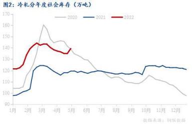截止5月4日,監測的26個城市庫存,冷軋板卷社會庫存為139.41萬噸。社會庫存雖未到達年內的峰值,但也同樣處于相對高位。年同比增加19.97萬噸,同比數據同樣驚人。主要是汽車、家電等制造業,在疫情下產量紛紛出現下滑,終端用鋼量明顯縮量。但短期局部區域物流受疫情防控影響,廠庫無法向社庫端去進行轉移,因此社庫的累積速度并不及廠庫。