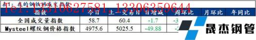 訊:全國建筑厚壁無縫鋼管成交量監測,成交量相對指數來看,全國58.7減1.7,北方46.3增5.3,華東79.4減6.7,南方44.7減0.8。今日螺紋鋼價格指數4975.6,較上一交易日減49.88。