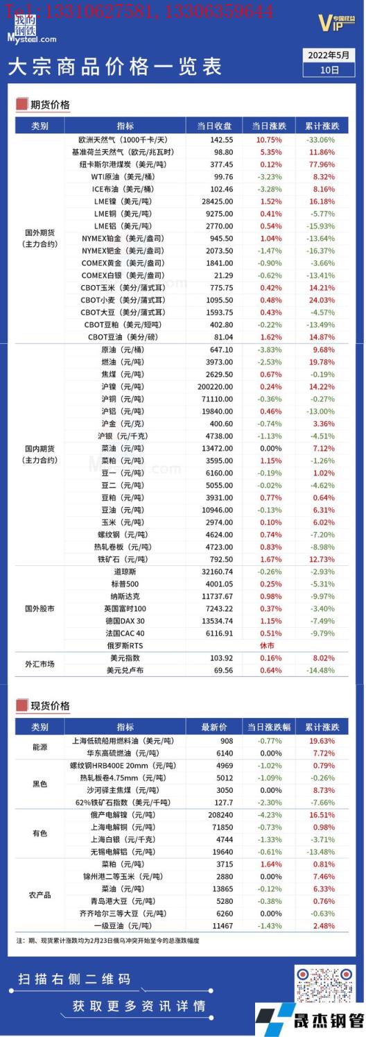 免責聲明:本網站(山東聊城晟杰無縫鋼管廠www.gdqiayu.com)刊載的“俄烏局勢丨大宗商品價格一覽表(5月10日)”等均源于網絡,版權歸原作者所有,且僅代表原作者觀點,本文所載信息僅供參考。轉載僅為學習與交流之目的,如無意中侵犯您的合法權益,請及時聯系刪除。本網站刊登此篇文章并不意味著本站贊同其觀點或證實其內容的真實性,我們不對其科學性、嚴肅性等作任何形式的保證。如果侵犯了您的版權,請盡快聯系我們予以撤銷,謝謝合作!