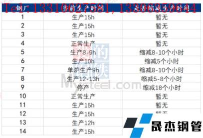 據不完全統計,截至5月12日,國內7家無縫厚壁鋼管廠家發布檢修計劃。其中,檢修時間最長的是沙鋼 ,2500m3*1高爐檢修31天,共計影響鐵水產量20.15萬噸。