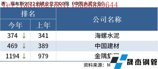 免責聲明:本網站(山東聊城晟杰無縫鋼管廠www.gdqiayu.com)刊載的“中國3家水泥企業上榜福布斯2022全球企業2000強”等均源于網絡,版權歸原作者所有,且僅代表原作者觀點,本文所載信息僅供參考。轉載僅為學習與交流之目的,如無意中侵犯您的合法權益,請及時聯系刪除。本網站刊登此篇文章并不意味著本站贊同其觀點或證實其內容的真實性,我們不對其科學性、嚴肅性等作任何形式的保證。如果侵犯了您的版權,請盡快聯系我們予以撤銷,謝謝合作!