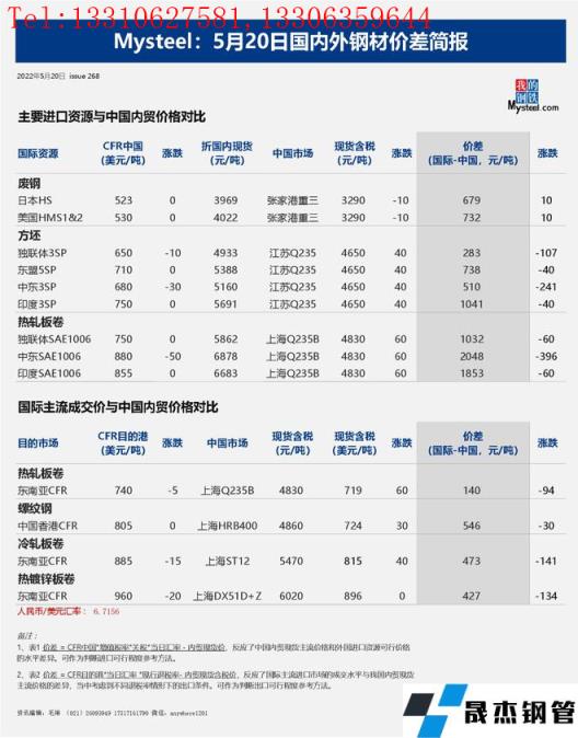 免責聲明:本網站(山東聊城晟杰無縫鋼管廠www.gdqiayu.com)刊載的“2022年05月20日日報:國內外鋼材_無縫鋼管價差匯總(2022.5.20)”等均源于網絡,版權歸原作者所有,且僅代表原作者觀點,本文所載信息僅供參考。轉載僅為學習與交流之目的,如無意中侵犯您的合法權益,請及時聯系刪除。本網站刊登此篇文章并不意味著本站贊同其觀點或證實其內容的真實性,我們不對其科學性、嚴肅性等作任何形式的保證。如果侵犯了您的版權,請盡快聯系我們予以撤銷,謝謝合作!