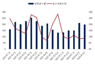 (1)進口供應:俄烏沖突下,烏克蘭海運出口清零,同時在中國球團進口量中,進口烏克蘭球團比例近兩年均值僅有16%,2021年二季度及2022年1-2月份,進口比例更是只有8%-11%。所以雖然烏克蘭海運出口被限,但對于中國國內進口球團總量影響有限,環比當前情況來看很難出現明顯下降趨勢。