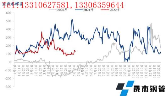我們知道,2210合約螺紋鋼由之前的過磅交割改為理計交割,而10合約熱卷交割仍為過磅。這樣當前盤面卷螺差折算成螺紋過磅的話,實際已經是負值。為何盤面卷螺差會持續低位。最主要的原因是疫情對板材需求的影響大于建筑厚壁無縫鋼管,家電、汽車等制造業和物流修復都需要一個相對長的時間,而對比建筑業產銷,從上游無縫厚壁鋼管廠家到下游工地可以最快的垂直到達,快速實現。在經濟下行周期,制造業表現低迷,為穩增長建筑業表現會相對好些,此時螺紋相對熱卷稍強,盤面卷螺差持續縮小。