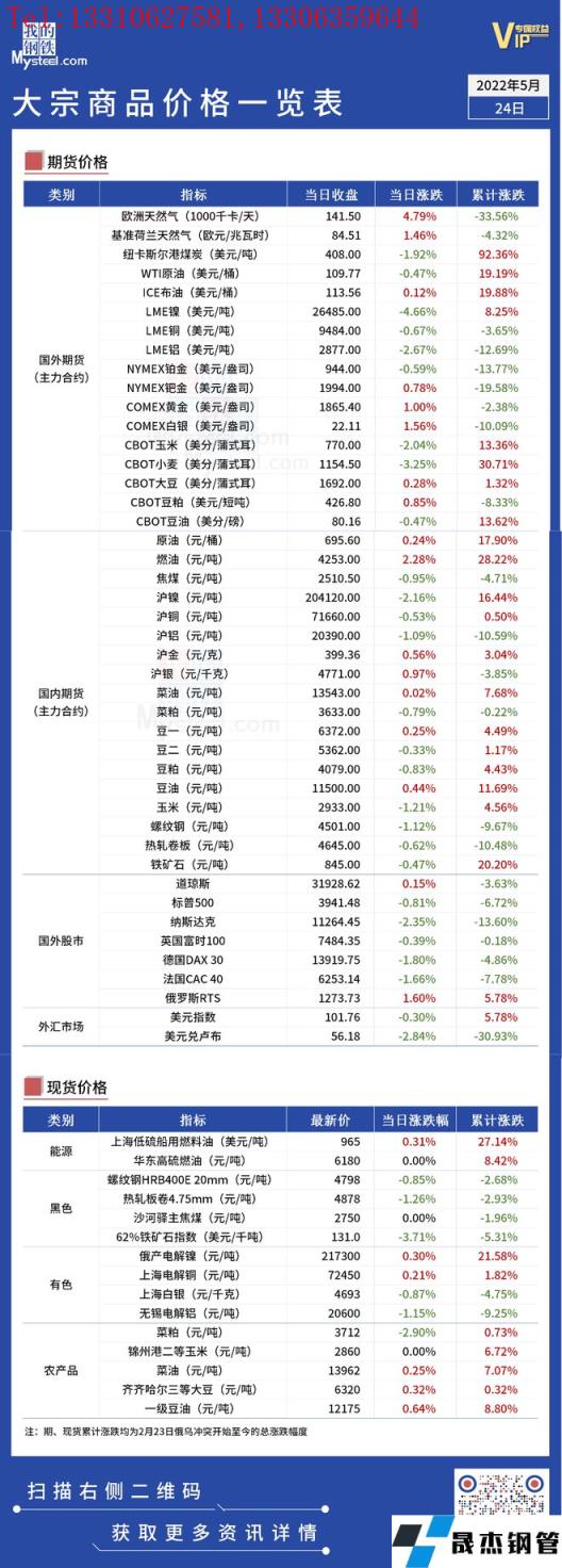 免責聲明:本網站(山東聊城晟杰無縫鋼管廠www.gdqiayu.com)刊載的“俄烏局勢丨大宗商品價格一覽表(5月24日)”等均源于網絡,版權歸原作者所有,且僅代表原作者觀點,本文所載信息僅供參考。轉載僅為學習與交流之目的,如無意中侵犯您的合法權益,請及時聯系刪除。本網站刊登此篇文章并不意味著本站贊同其觀點或證實其內容的真實性,我們不對其科學性、嚴肅性等作任何形式的保證。如果侵犯了您的版權,請盡快聯系我們予以撤銷,謝謝合作!