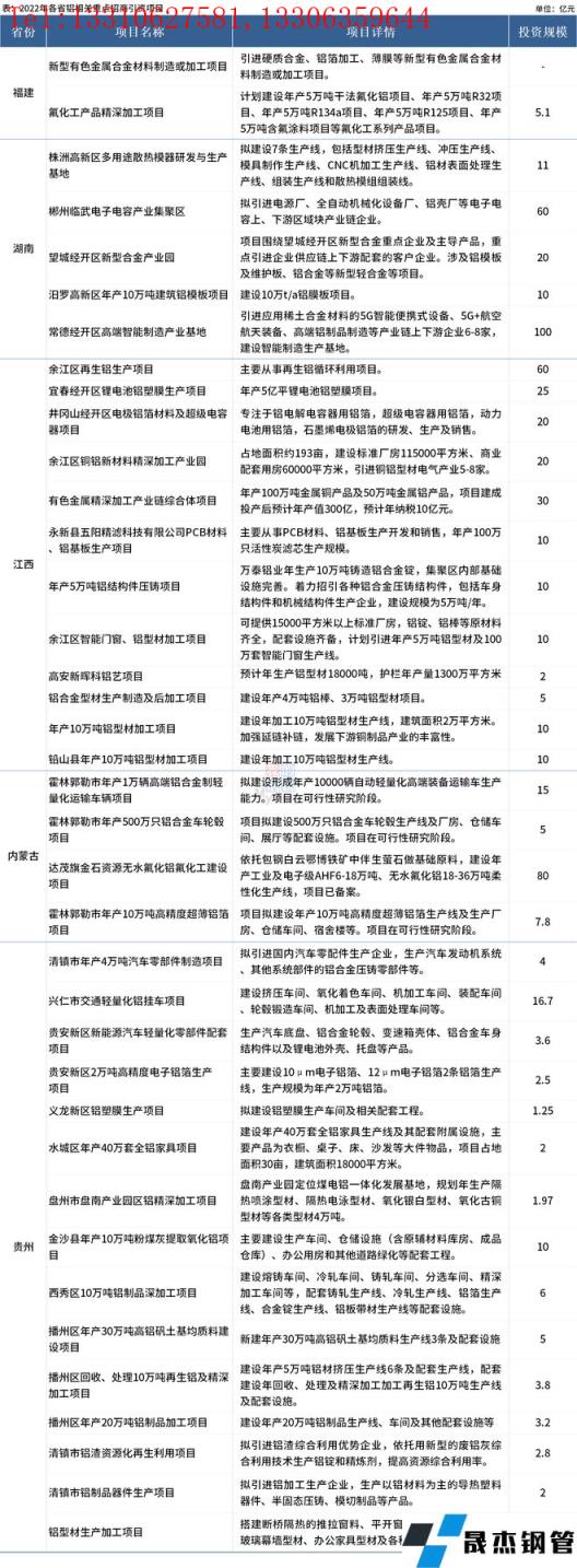 近期各地陸續發布2022年重點招商項目清單,據不完全統計,截至5月26日,共有5個省份發布的2022年重點招商項目清單中涉及鋁相關項目,合計共39項,總投資592億元。詳情名單如下: