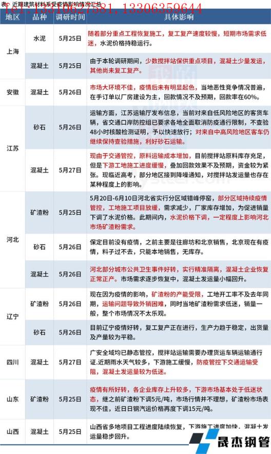截至5月27日,據百年建筑網調研,8個省份建材市場受到了不同程度的影響。進入五月下旬后,施工整體進度尚未進入“減速”階段,今年整體施工進度提升緩慢,市場需求降幅拐點未來臨。目前疫情防控形勢繼續好轉,建筑材料發運量有一定上升空間。現華東地區疫情雖得到了一定的控制,但由于交通管控因素,材料運輸仍存在一定壓力。具體情況如下: