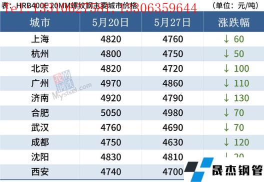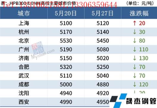 據監測,截至5月27日,全國主要城市20mm三級抗震螺紋鋼均價4765元/噸,較5月20日下跌84元/噸;8.0mmHPB300高線均價5023/噸,較5月20日下跌78元/噸。