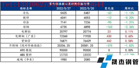 免責聲明:本網站(山東聊城晟杰無縫鋼管廠www.gdqiayu.com)刊載的“家電原材料周報(5.23-5.27)”等均源于網絡,版權歸原作者所有,且僅代表原作者觀點,本文所載信息僅供參考。轉載僅為學習與交流之目的,如無意中侵犯您的合法權益,請及時聯系刪除。本網站刊登此篇文章并不意味著本站贊同其觀點或證實其內容的真實性,我們不對其科學性、嚴肅性等作任何形式的保證。如果侵犯了您的版權,請盡快聯系我們予以撤銷,謝謝合作!