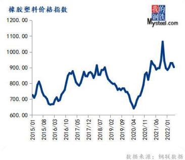 5月份橡膠塑料價格指數為903.24,環比下跌2.66%,同比下跌1.08%。