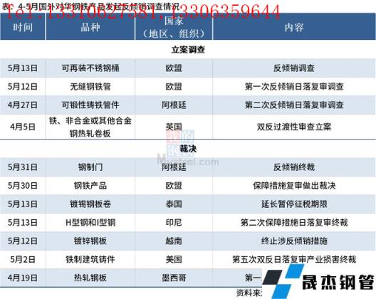 免責聲明:本網站(山東聊城晟杰無縫鋼管廠www.gdqiayu.com)刊載的“4-5月國外對華鋼鐵產品發起反傾銷調查情況”等均源于網絡,版權歸原作者所有,且僅代表原作者觀點,本文所載信息僅供參考。轉載僅為學習與交流之目的,如無意中侵犯您的合法權益,請及時聯系刪除。本網站刊登此篇文章并不意味著本站贊同其觀點或證實其內容的真實性,我們不對其科學性、嚴肅性等作任何形式的保證。如果侵犯了您的版權,請盡快聯系我們予以撤銷,謝謝合作!