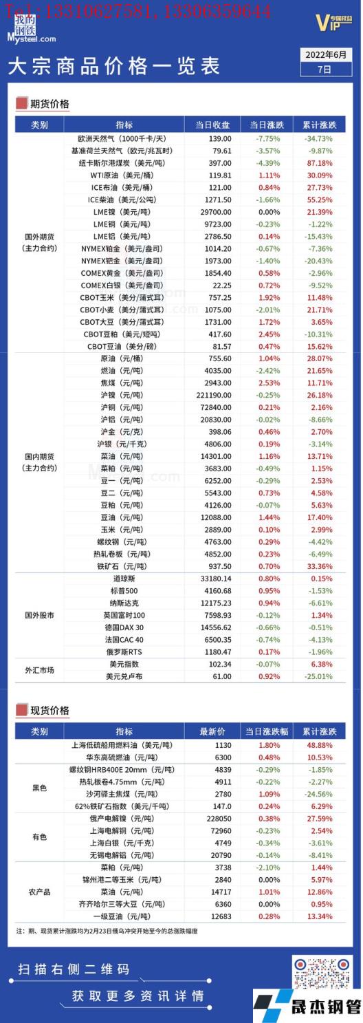 免責聲明:本網站(山東聊城晟杰無縫鋼管廠www.gdqiayu.com)刊載的“俄烏局勢丨大宗商品價格一覽表(6月7日)”等均源于網絡,版權歸原作者所有,且僅代表原作者觀點,本文所載信息僅供參考。轉載僅為學習與交流之目的,如無意中侵犯您的合法權益,請及時聯系刪除。本網站刊登此篇文章并不意味著本站贊同其觀點或證實其內容的真實性,我們不對其科學性、嚴肅性等作任何形式的保證。如果侵犯了您的版權,請盡快聯系我們予以撤銷,謝謝合作!