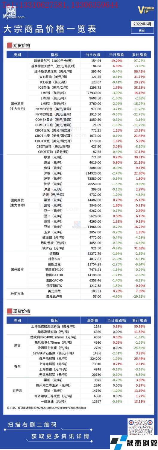 免責聲明:本網站(山東聊城晟杰無縫鋼管廠www.gdqiayu.com)刊載的“俄烏局勢丨大宗商品價格一覽表(6月9日)”等均源于網絡,版權歸原作者所有,且僅代表原作者觀點,本文所載信息僅供參考。轉載僅為學習與交流之目的,如無意中侵犯您的合法權益,請及時聯系刪除。本網站刊登此篇文章并不意味著本站贊同其觀點或證實其內容的真實性,我們不對其科學性、嚴肅性等作任何形式的保證。如果侵犯了您的版權,請盡快聯系我們予以撤銷,謝謝合作!
